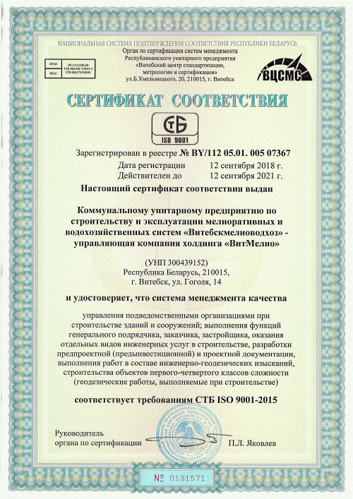 Государственное предприятие «Витебскмелиоводхоз» - управляющая компания холдинга «ВитМелио» представляет собой современное многопрофильное учреждение, которое отвечает за содержание мелиоративных систем на территории Витебщины. Основной задачей нашей компании является проведение мероприятий, направленных на повышение плодородия земель региона, что имеет решающее значение для агропромышленного комплекса.